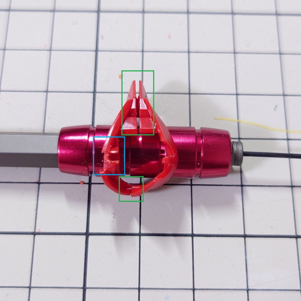 緑四角部分を圧着、青四角部分は後ハメ様に少し削って広げておく。