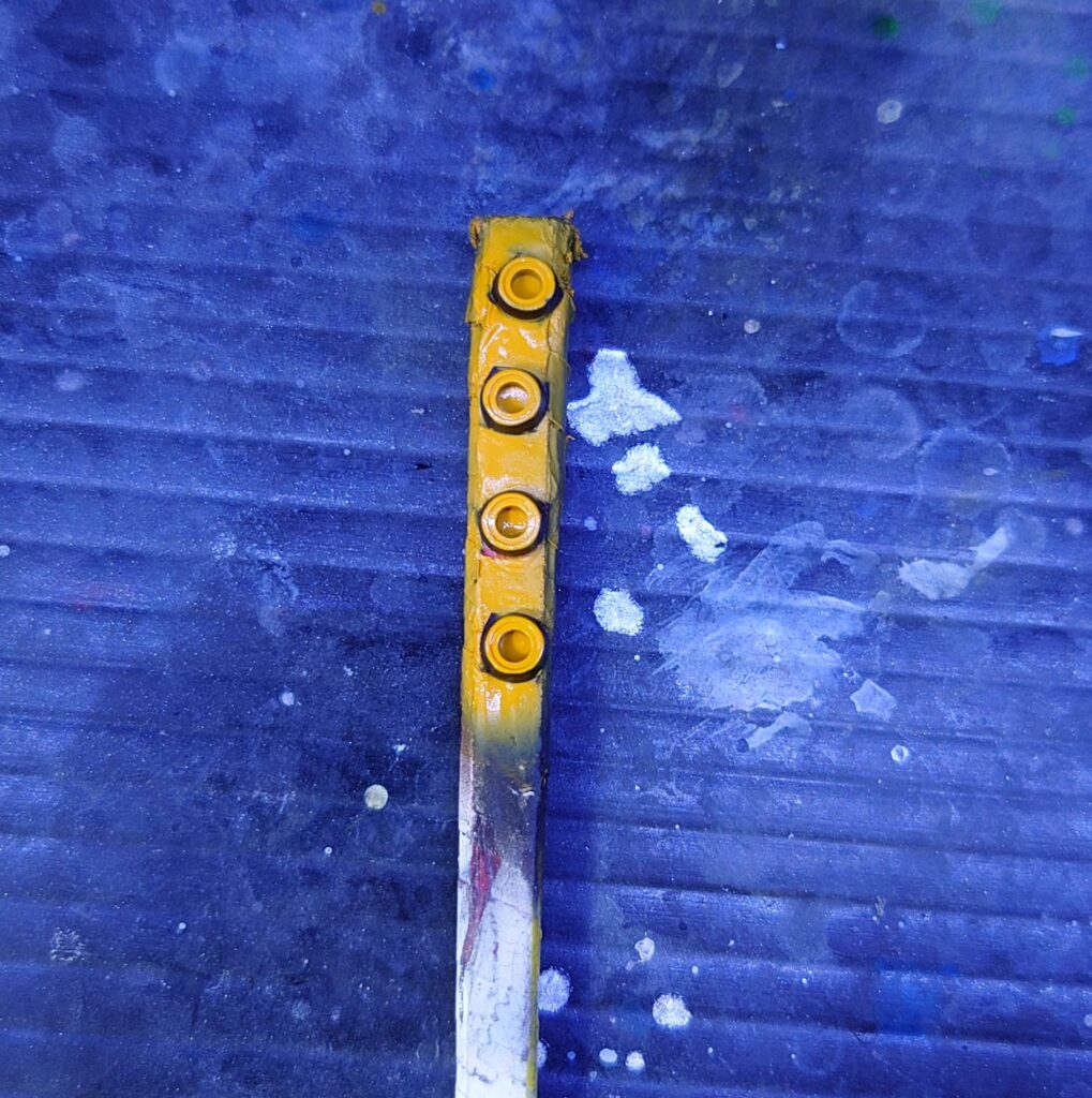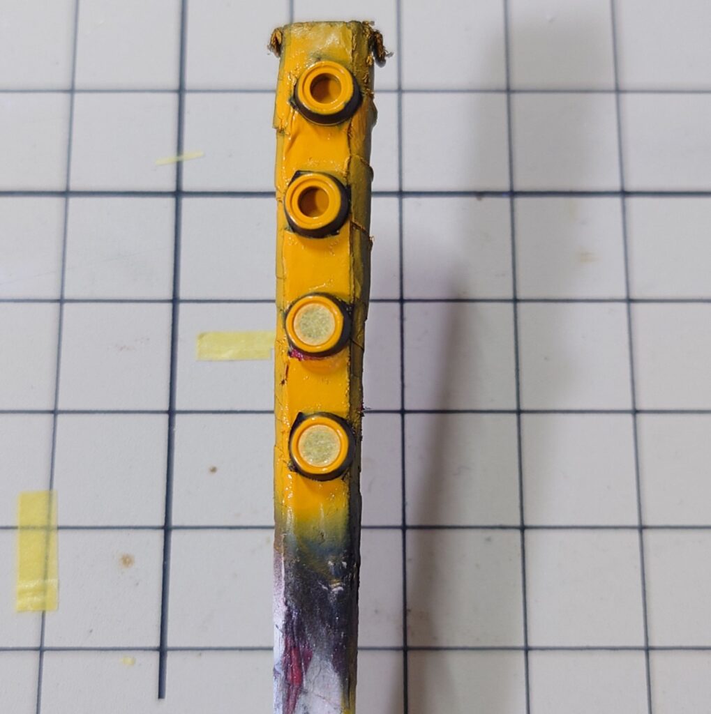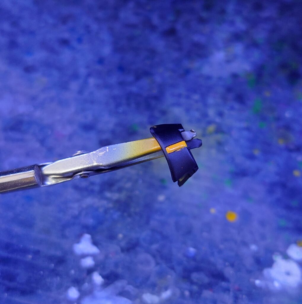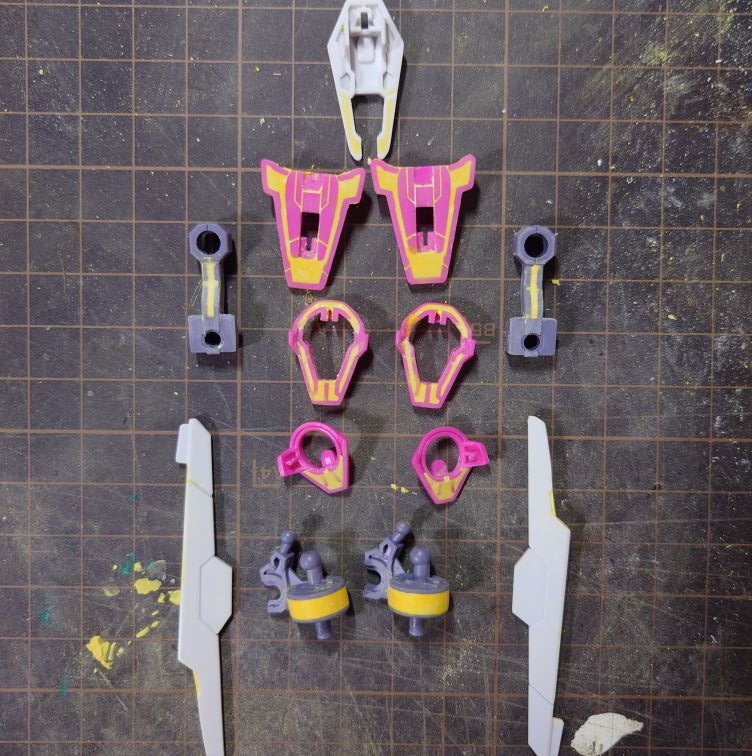 腕関節パーツの塗り分け。中はオレンジで外は青。マジかよ。。。