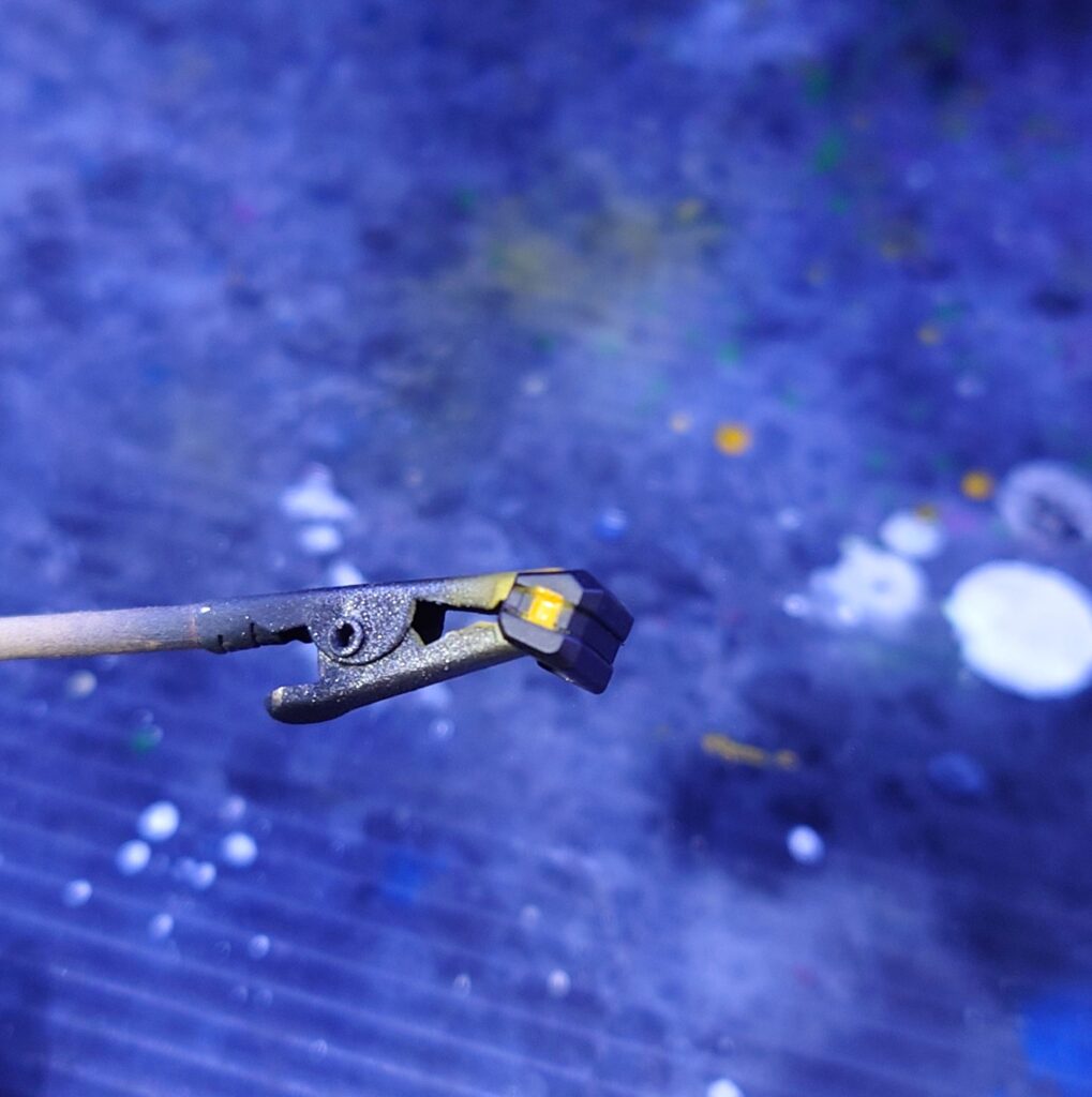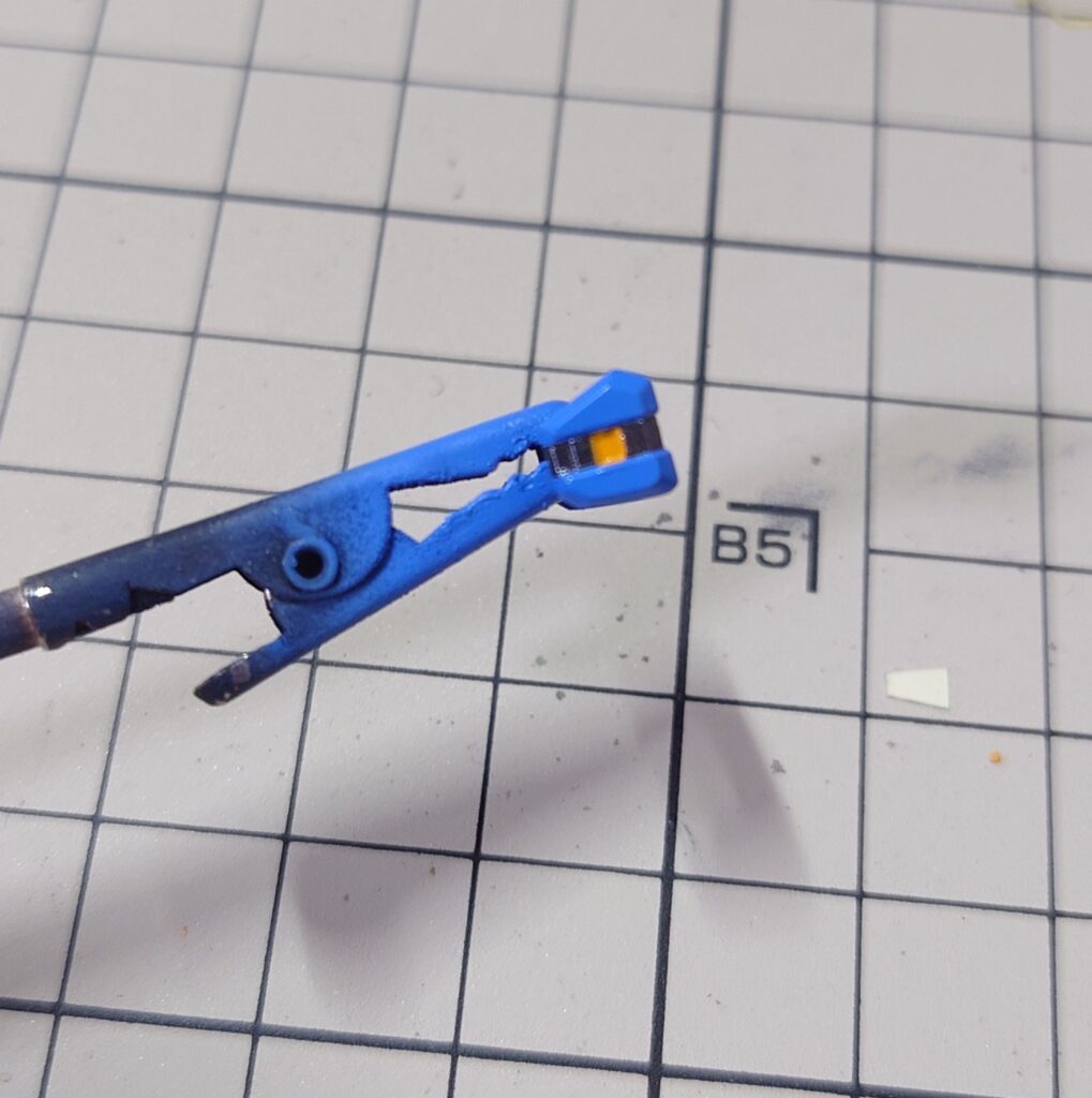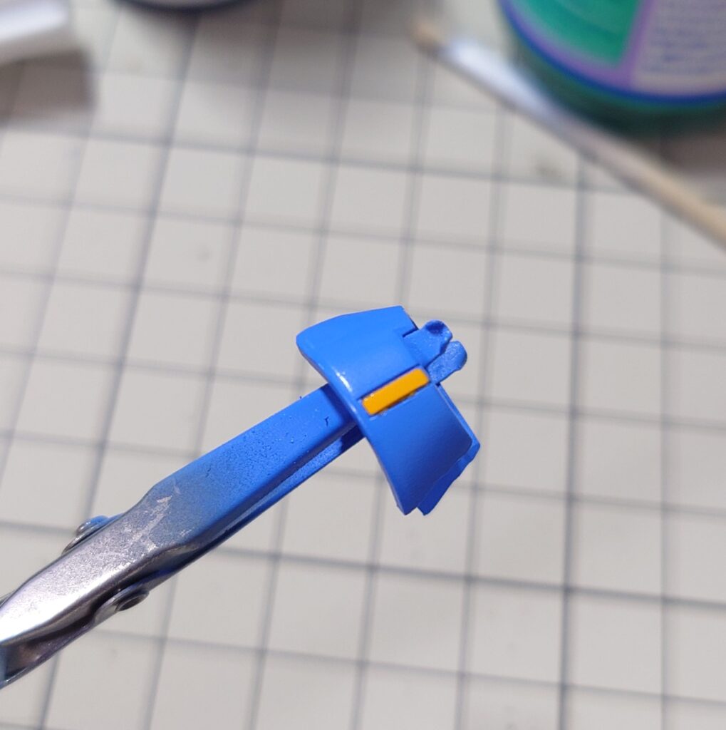 どの順番で塗るのが正解なのか。。。一番奥まっているワンポイントのオレンジ→ライン状のガンメタ→外装の青 がベストか。
