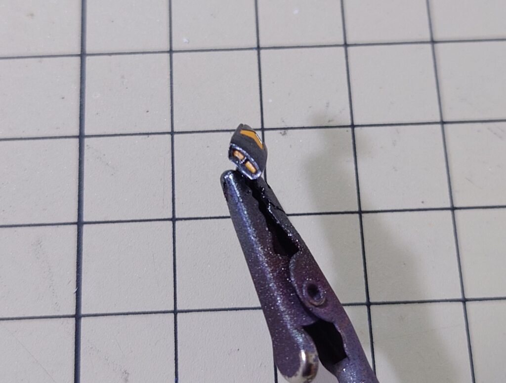 ガンメタに塗り分けたところの写真を撮り忘れちゃった。この細かい四角にマスキングしましたよ、えぇ。。。