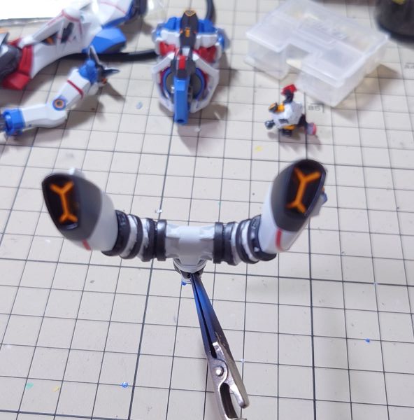 あと、バーニア内のオレンジのところも塗り分け。バーニア内部をオレンジで塗った後、マスキングして、全体をメタルブラック。